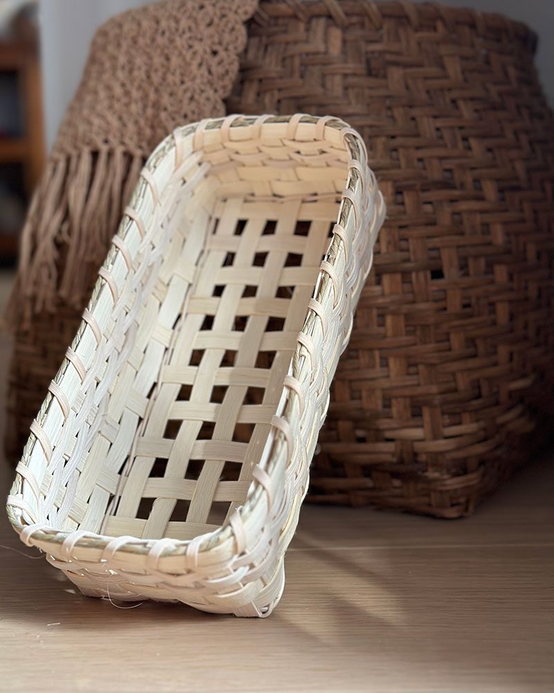 You will learn to weave a small basket great for things like paper or linen napkins, rolls, crackers or other kitchen table items. You will  start with forming the base, twining, weaving the sides, and lashing the rim to finish.